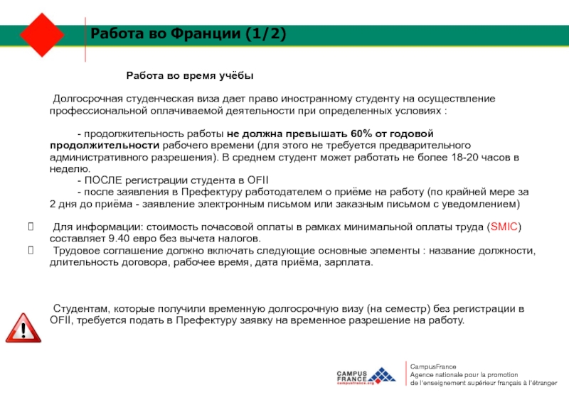 - продолжительность работы не должна превышать 60% от годовой продолжительности рабочего времени (для этого не требуется предварительного административного разрешения). В среднем студент может работать не более 18-20 часов в неделю.