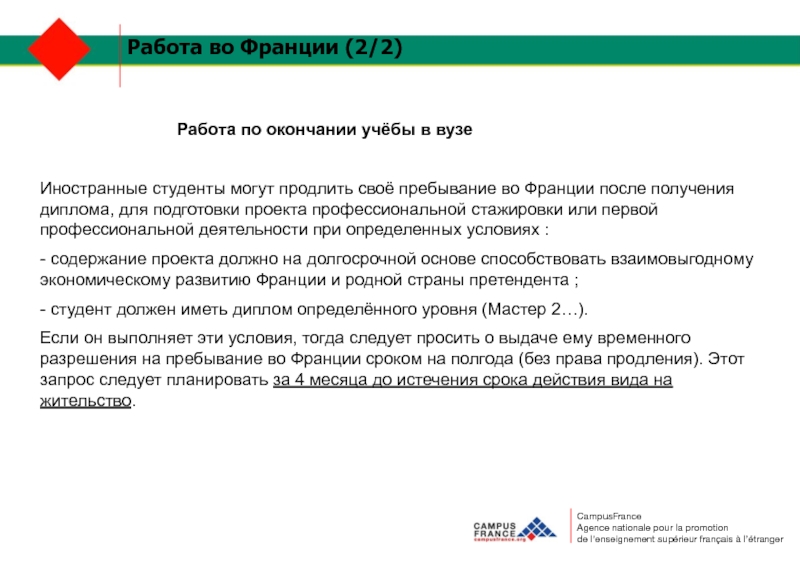продлить своё пребывание во Франции после получения диплома, для подготовки проекта профессиональной стажировки или первой профессиональной деятельности при определенных условиях :