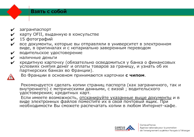 Чтобы обезопасить себя от возможных расходов на медицинское обслуживание в первые дни и недели вашего пребывания во Франции (пока вы не сделали основную французскую студенческую страховку), настоятельно рекомендуем вам сделать обычную российскую медицинскую страховку для выезжающих за рубеж.