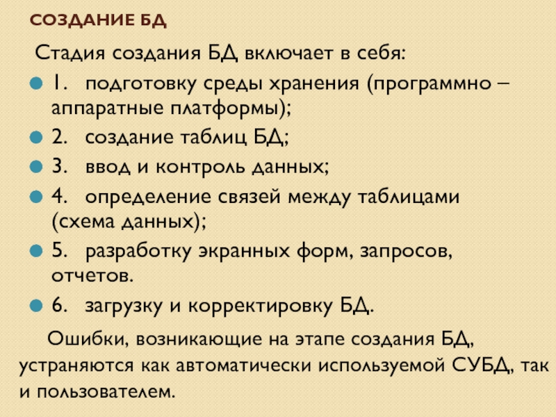 Ошибки, возникающие на этапе создания БД, устраняются как автоматически используемой СУБД, так и пользователем.