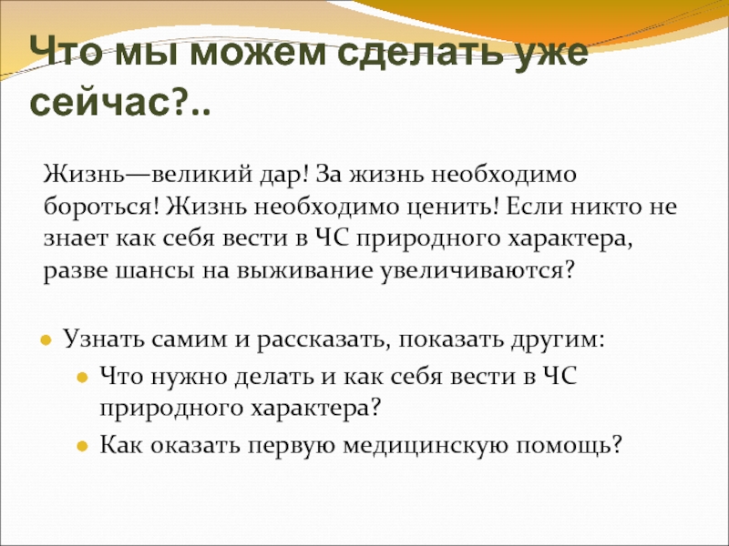 Жизнь необходимо ценить! Если никто не знает как себя вести в ЧС природного характера, разве шансы на выживание увеличиваются?
