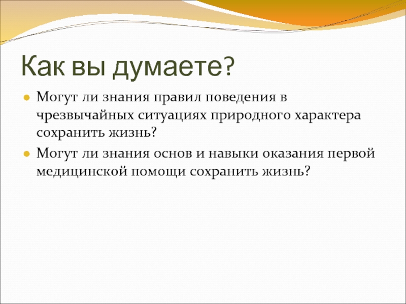 характера (Наводнение)? Знания правил поведения в ЧС природного характера увеличивают ли шансы на сохранение здоровья и жизни человека в ЧС?