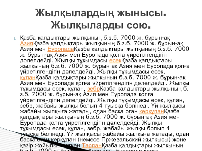 7000 ж. бұрын-ақ Азия мен ЕуропадаҚазба қалдықтары жылқының б.з.б. 7000 ж. бұрын-ақ Азия мен Еуропада қолға үйретілгендігін дәлелдейді. Жылқы тұқымдасы есекҚазба қалдықтары жылқының б.з.б. 7000 ж. бұрын-ақ Азия мен Еуропада қолға үйретілгендігін дәлелдейді. Жылқы тұқымдасы есек, құланҚазба қалдықтары жылқының б.з.б. 7000 ж. бұрын-ақ Азия мен Еуропада қолға үйретілгендігін дәлелдейді. Жылқы тұқымдасы есек, құлан, зебрҚазба қалдықтары жылқының б.з.б. 7000 ж. бұрын-ақ Азия мен Еуропада қолға үйретілгендігін дәлелдейді. Жылқы тұқымдасы есек, құлан, зебр, жабайы жылқы болып 4 туысқа бөлінеді. Үй жылқысы жабайы жылқыға жатады, одан басқа оған керқұланҚазба қалдықтары жылқының б.з.б. 7000 ж. бұрын-ақ Азия мен Еуропада қолға үйретілгендігін дәлелдейді. Жылқы тұқымдасы есек, құлан, зебр, жабайы жылқы болып 4 туысқа бөлінеді. Үй жылқысы жабайы жылқыға жатады, одан басқа оған керқұлан (немесе Пржевальский жылқысы) және қазір жойылып кеткен ТарпаңҚазба қалдықтары жылқының б.з.б. 7000 ж. бұрын-ақ Азия мен Еуропада қолға үйретілгендігін дәлелдейді. Жылқы тұқымдасы есек, құлан, зебр, жабайы жылқы болып 4 туысқа бөлінеді. Үй жылқысы жабайы жылқыға жатады, одан басқа оған керқұлан (немесе Пржевальский жылқысы) және қазір жойылып кеткен Тарпаң жатады. Соңғысы 19 ғ.Қазба қалдықтары жылқының б.з.б. 7000 ж. бұрын-ақ Азия мен Еуропада қолға үйретілгендігін дәлелдейді. Жылқы тұқымдасы есек, құлан, зебр, жабайы жылқы болып 4 туысқа бөлінеді. Үй жылқысы жабайы жылқыға жатады, одан басқа оған керқұлан (немесе Пржевальский жылқысы) және қазір жойылып кеткен Тарпаң жатады. Соңғысы 19 ғ. дейін Батыс ҚазақстанҚазба қалдықтары жылқының б.з.б. 7000 ж. бұрын-ақ Азия мен Еуропада қолға үйретілгендігін дәлелдейді. Жылқы тұқымдасы есек, құлан, зебр, жабайы жылқы болып 4 туысқа бөлінеді. Үй жылқысы жабайы жылқыға жатады, одан басқа оған керқұлан (немесе Пржевальский жылқысы) және қазір жойылып кеткен Тарпаң жатады. Соңғысы 19 ғ. дейін Батыс Қазақстан, Батыс СібірҚазба қалдықтары жылқының б.з.б. 7000 ж. бұрын-ақ Азия мен Еуропада қолға үйретілгендігін дәлелдейді. Жылқы тұқымдасы есек, құлан, зебр, жабайы жылқы болып 4 туысқа бөлінеді. Үй жылқысы жабайы жылқыға жатады, одан басқа оған керқұлан (немесе Пржевальский жылқысы) және қазір жойылып кеткен Тарпаң жатады. Соңғысы 19 ғ. дейін Батыс Қазақстан, Батыс Сібір, РесейдіңҚазба қалдықтары жылқының б.з.б. 7000 ж. бұрын-ақ Азия мен Еуропада қолға үйретілгендігін дәлелдейді. Жылқы тұқымдасы есек, құлан, зебр, жабайы жылқы болып 4 туысқа бөлінеді. Үй жылқысы жабайы жылқыға жатады, одан басқа оған керқұлан (немесе Пржевальский жылқысы) және қазір жойылып кеткен Тарпаң жатады. Соңғысы 19 ғ. дейін Батыс Қазақстан, Батыс Сібір, Ресейдің еуропалық бөлігінің оңтүстік және оңтүстік-шығыс аймақтарын және кейбір Еуропа елдерін мекен еткен. Керқұлан үйірлері қазір МоңғолиядаҚазба қалдықтары жылқының б.з.б. 7000 ж. бұрын-ақ Азия мен Еуропада қолға үйретілгендігін дәлелдейді. Жылқы тұқымдасы есек, құлан, зебр, жабайы жылқы болып 4 туысқа бөлінеді. Үй жылқысы жабайы жылқыға жатады, одан басқа оған керқұлан (немесе Пржевальский жылқысы) және қазір жойылып кеткен Тарпаң жатады. Соңғысы 19 ғ. дейін Батыс Қазақстан, Батыс Сібір, Ресейдің еуропалық бөлігінің оңтүстік және оңтүстік-шығыс аймақтарын және кейбір Еуропа елдерін мекен еткен. Керқұлан үйірлері қазір Моңғолияда ғана кездесе
