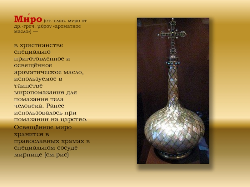Слайд 6Ми́ро (ст.-слав. мѵро от др.-греч. μύρον «ароматное масло») —
