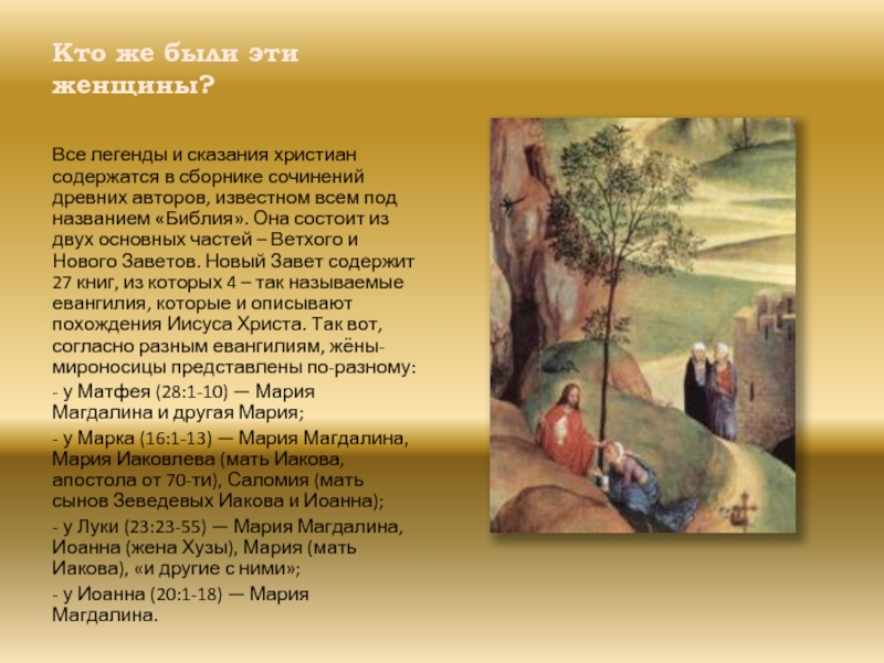сборнике сочинений древних авторов, известном всем под названием «Библия». Она состоит из двух основных частей – Ветхого и Нового Заветов. Новый Завет содержит 27 книг, из которых 4 – так называемые евангилия, которые и описывают похождения Иисуса Христа. Так вот, согласно разным евангилиям, жёны-мироносицы представлены по-разному:
