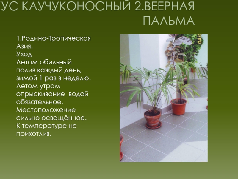Слайд 151.ФИКУС КАУЧУКОНОСНЫЙ 2.ВЕЕРНАЯ ПАЛЬМА