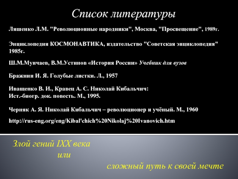Черняк А. Я. Николай Кибальчич – революционер и учёный. М., 1960