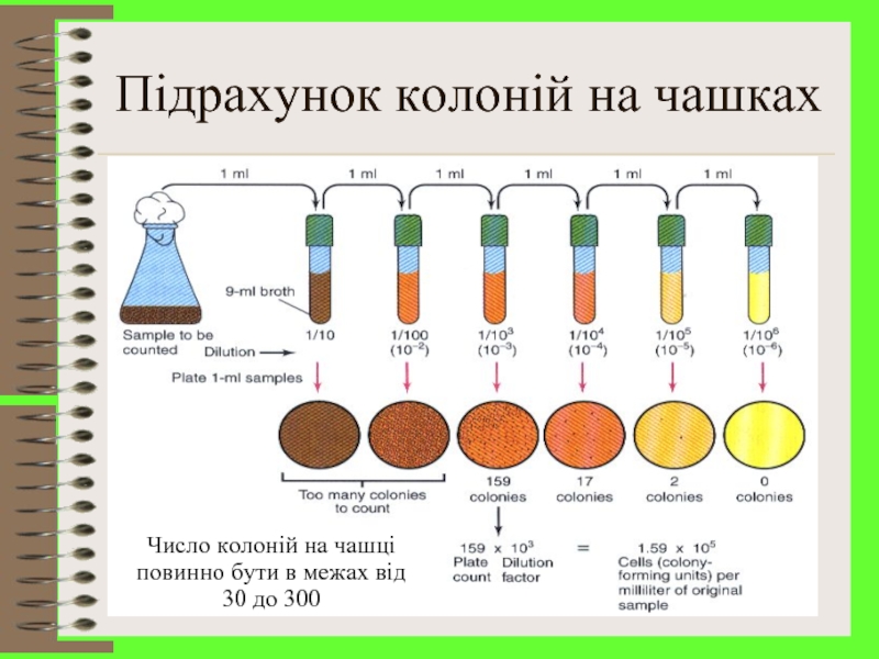 Перемножити число колоній, які виросли на чашках на розведення і знайти