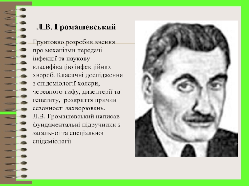 інфекційних хвороб. Класичні дослідження з епідеміології холери, черевного тифу, дизентерії та гепатиту, розкриття причин сезонності захворювань. Л.В. Громашевський написав фундаментальні підручники з загальної та спеціальної епідеміології