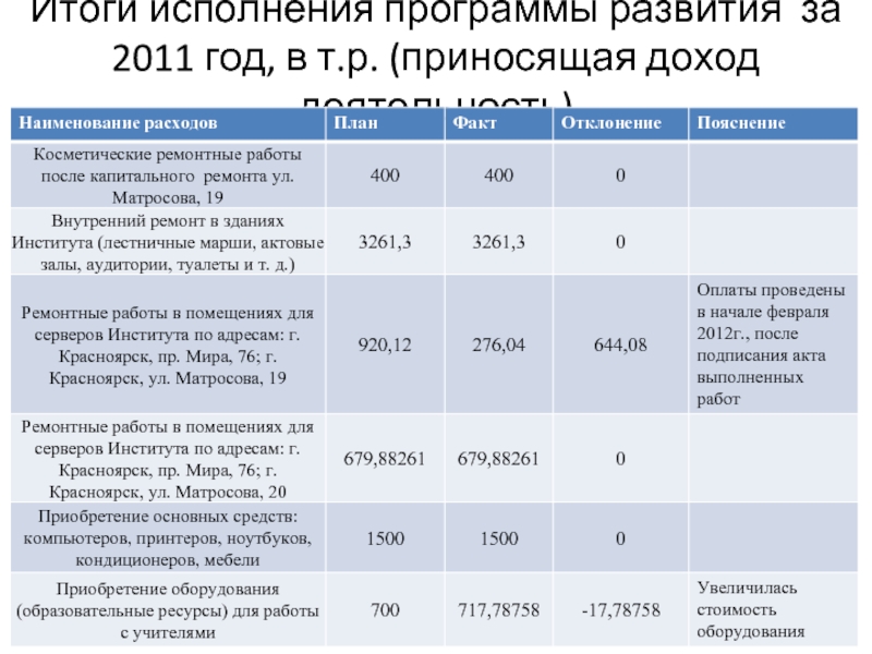 Слайд 35Итоги исполнения программы развития за 2011 год, в т.р. (приносящая доход