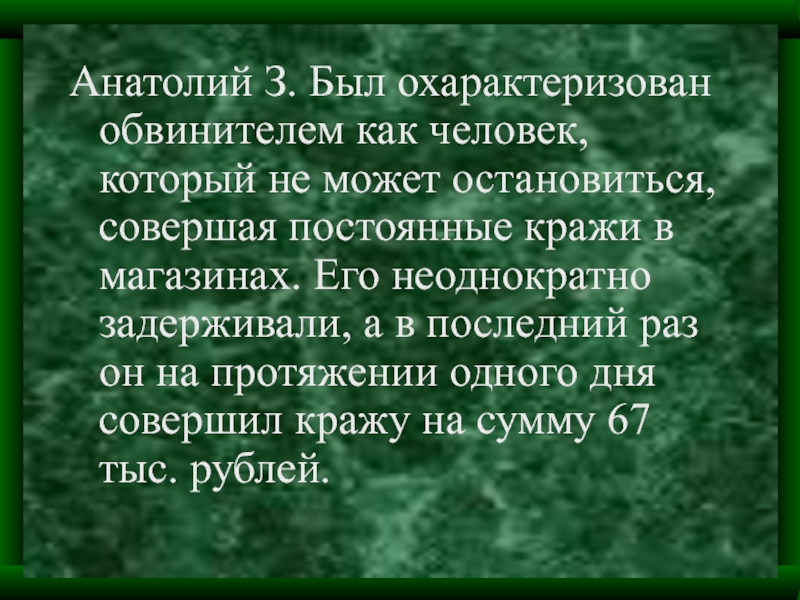 Слайд 13Анатолий З. Был охарактеризован обвинителем как человек, который не может остановиться,
