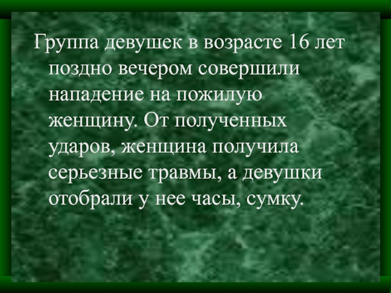 Слайд 12Группа девушек в возрасте 16 лет поздно вечером совершили нападение на