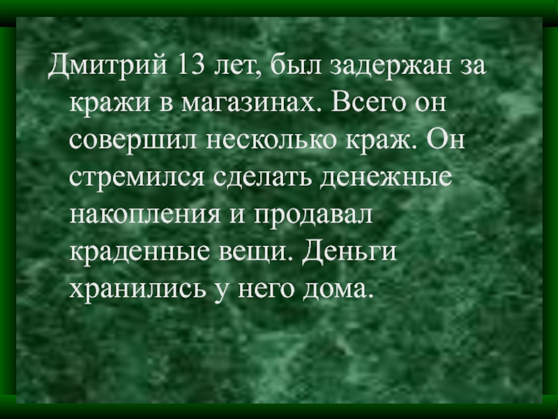 Слайд 11Дмитрий 13 лет, был задержан за кражи в магазинах. Всего он
