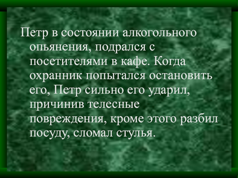 Слайд 10Петр в состоянии алкогольного опьянения, подрался с посетителями в кафе. Когда