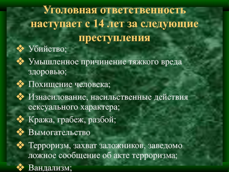 Слайд 22Уголовная ответственность наступает с 14 лет за следующие преступления