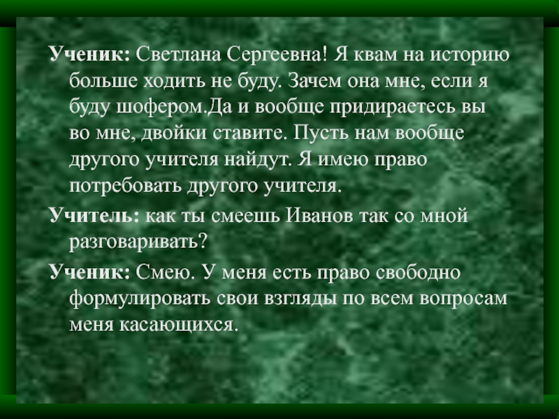 Ученик: Смею. У меня есть право свободно формулировать свои взгляды по всем вопросам меня касающихся.