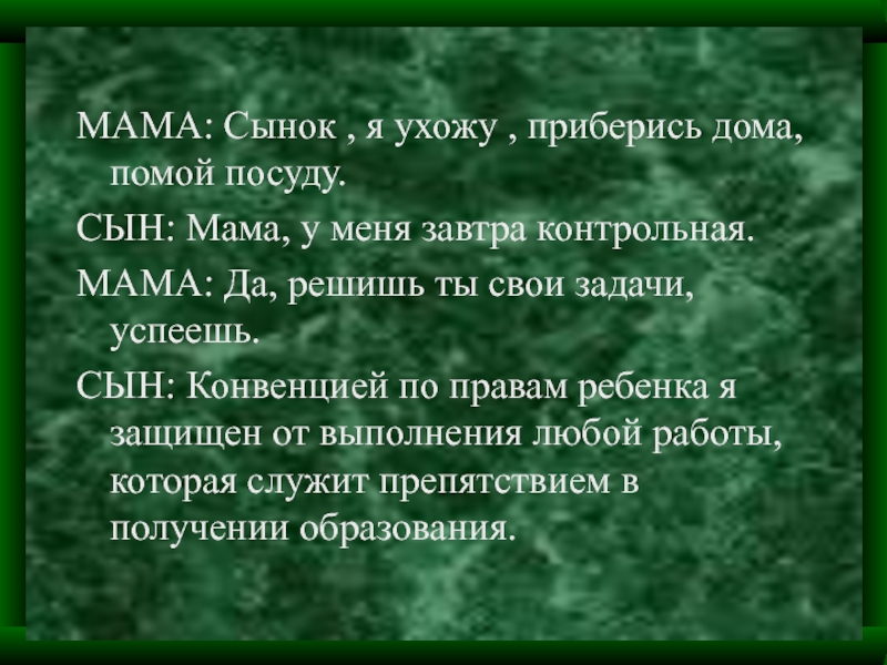 СЫН: Но мама! Ты все равно в 11 часов еще не спишь. Кроме того я имею право на свободу ассоциаций и мирных собраний.