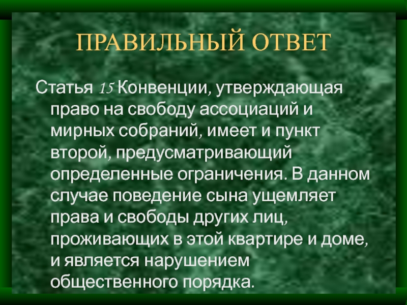 собраний, имеет и пункт второй, предусматривающий определенные ограничения. В данном случае поведение сына ущемляет права и свободы других лиц, проживающих в этой квартире и доме, и является нарушением общественного порядка.