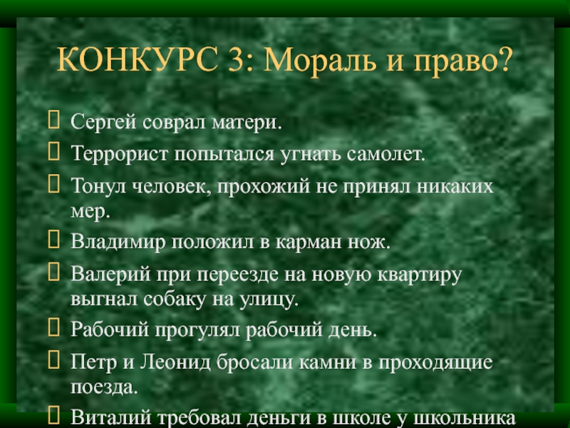 Слайд 14КОНКУРС 3: Мораль и право?