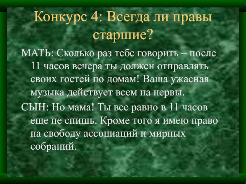 Слайд 15Конкурс 4: Всегда ли правы старшие?