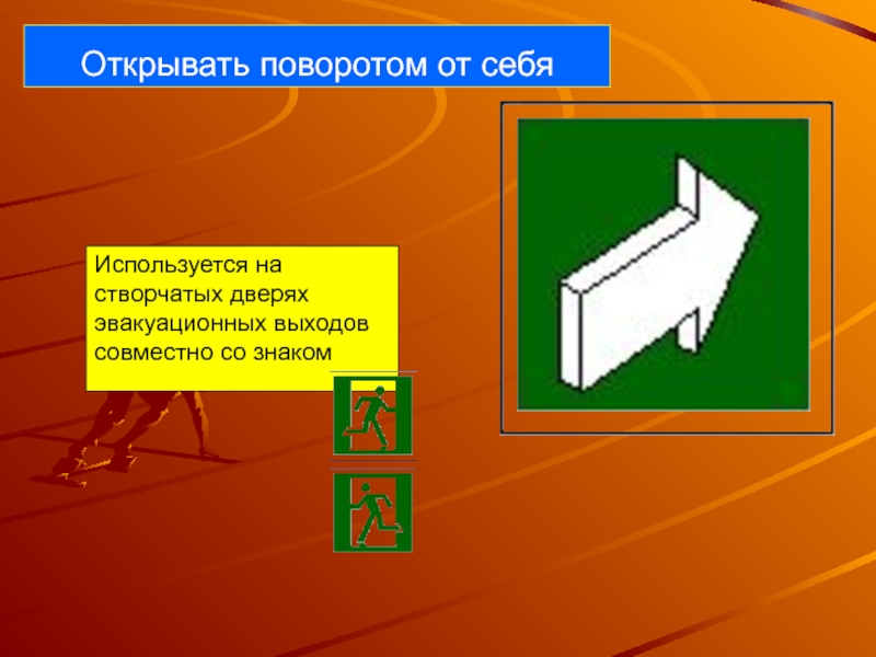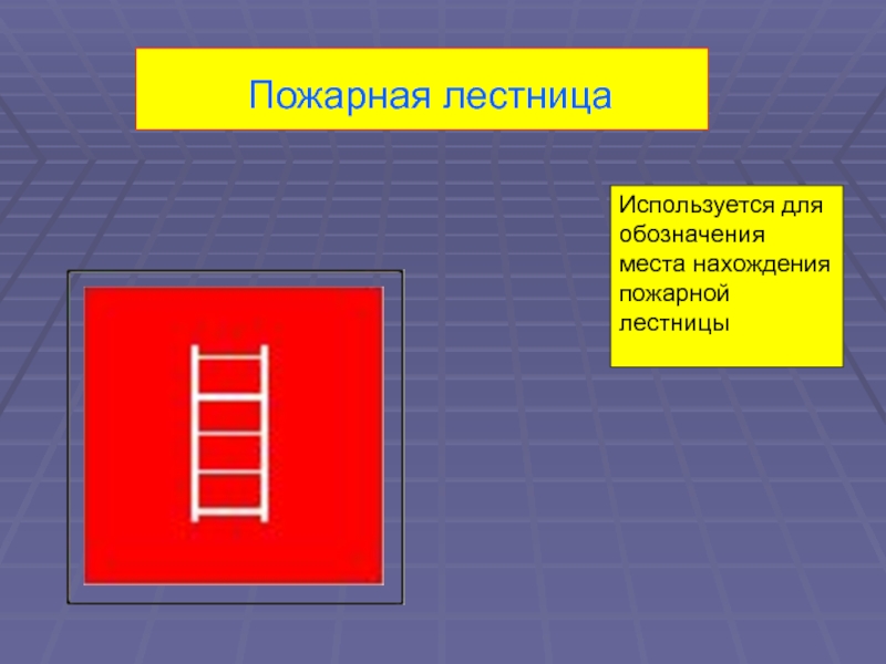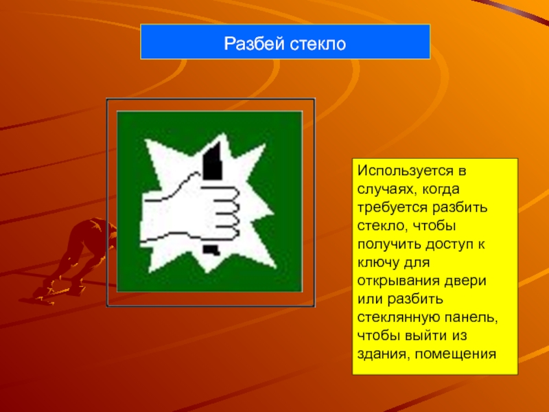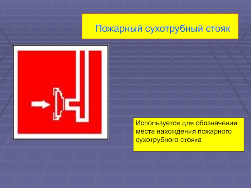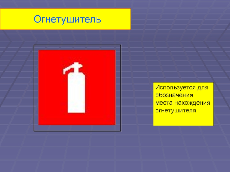 Используется для обозначения места ручного пуска установок пожарной сигнализации, противодымной защиты и пожаротушения; места (пункта) подачи сигнала пожарной тревоги