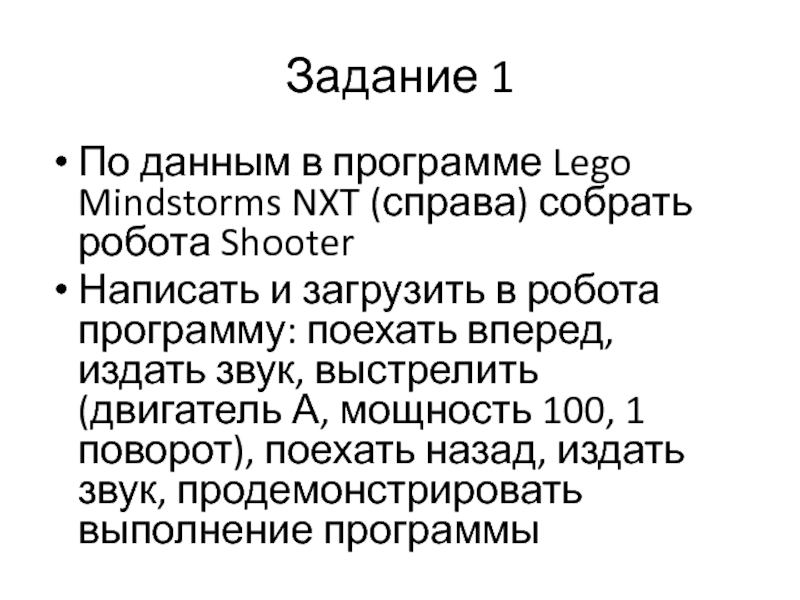 Написать и загрузить в робота программу: поехать вперед, издать звук, выстрелить (двигатель А, мощность 100, 1 поворот), поехать назад, издать звук, продемонстрировать выполнение программы
