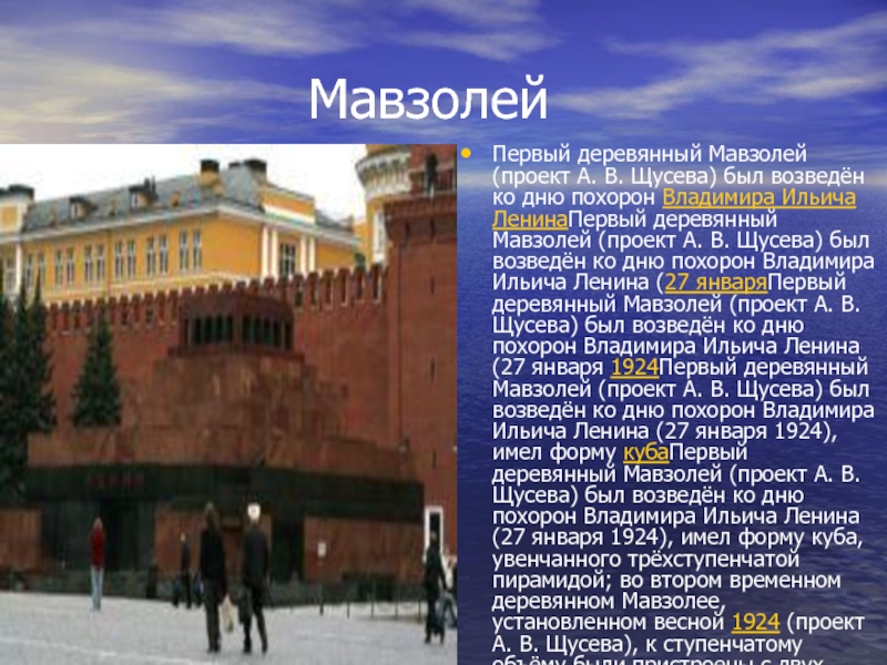 (проект А. В. Щусева) был возведён ко дню похорон Владимира Ильича ЛенинаПервый деревянный Мавзолей (проект А. В. Щусева) был возведён ко дню похорон Владимира Ильича Ленина (27 январяПервый деревянный Мавзолей (проект А. В. Щусева) был возведён ко дню похорон Владимира Ильича Ленина (27 января 1924Первый деревянный Мавзолей (проект А. В. Щусева) был возведён ко дню похорон Владимира Ильича Ленина (27 января 1924), имел форму кубаПервый деревянный Мавзолей (проект А. В. Щусева) был возведён ко дню похорон Владимира Ильича Ленина (27 января 1924), имел форму куба, увенчанного трёхступенчатой пирамидой; во втором временном деревянном Мавзолее, установленном весной 1924 (проект А. В. Щусева), к ступенчатому объёму были пристроены с двух сторон трибуны. Мавзолеем может также называться здание, которое содержит множество склепов для погребения. Современные мавзолеи часто имеют колумбарий для праха кремируемого. Мавзолеи могут быть самостоятельными зданиями или частью большего сооружения — церкви, трибуны. В исламских странах имеется немало мавзолеев, почитаемых населением и представляющих религиозную и архитектурную ценность