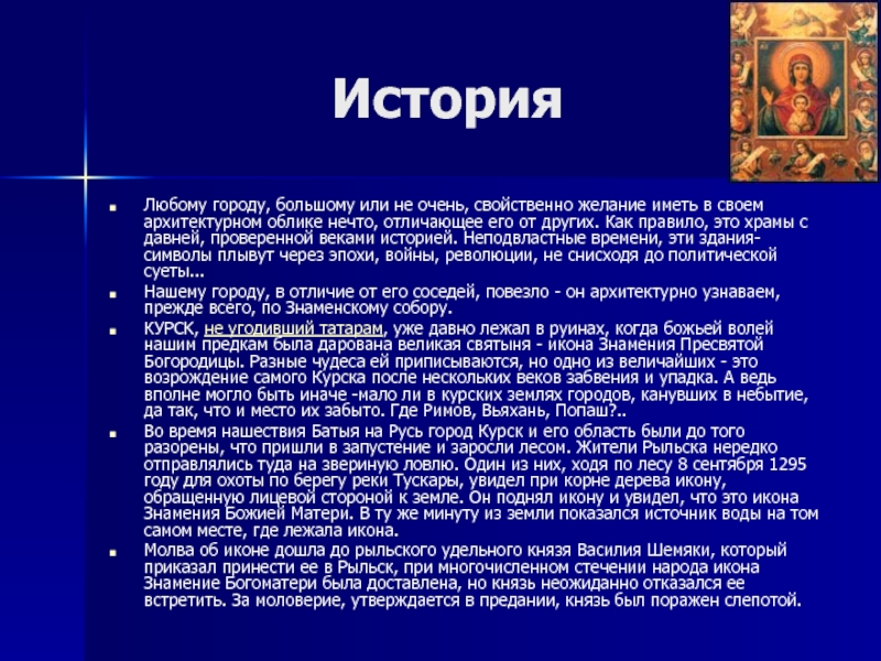 КУPCK, не угодивший татарам, уже давно лежал в руинах, когда божьей волей нашим предкам была дарована великая святыня - икона Знамения Пресвятой Богородицы. Разные чудеса ей приписываются, но одно из величайших - это возрождение самого Курска после нескольких веков забвения и упадка. А ведь вполне могло быть иначе -мало ли в курских землях городов, канувших в небытие, да так, что и место их забыто. Где Римов, Вьяхань, Попаш?..