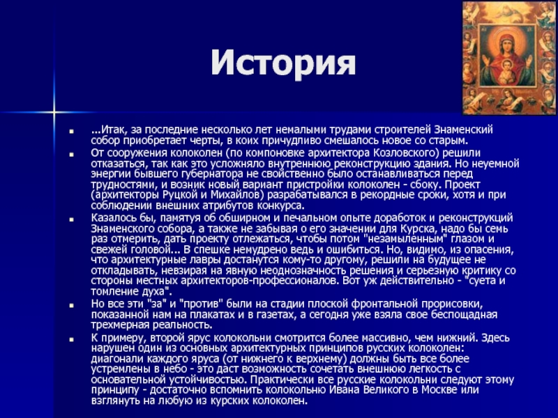 Прежде чем говорить о результатах наружной реставрации, вспомним, что храм этот, духовный правопреемник стертого перипетиями времени монастыря, вобрал в себя святость церквей и соборов, деревянных и каменных, что стояли когда-то на его месте со времен основания Курска. Всем им, как и сегодняшнему собору, суждено было на протяжении долгих столетий вторить участи своих прихожан, их сыновей и внуков. И это делает главный курский храм духовным символом нашего города, имеющим неоспоримое право на бережное отношение к себе - теперь уже со стороны светских архитекторов и власть имущих, прикладывающих руку к его реставрации.