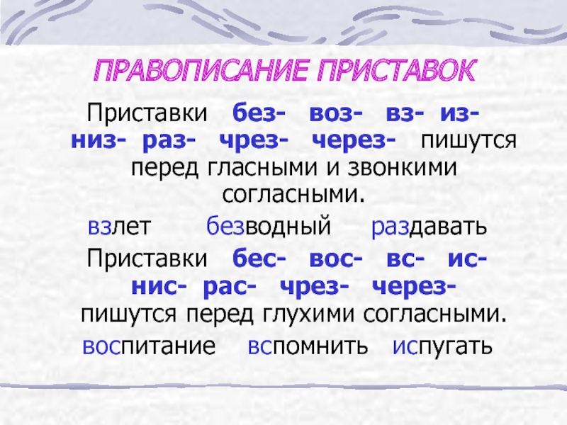 Приставки бес- вос- вс- ис- нис- рас- чрез- через- пишутся перед глухими согласными.