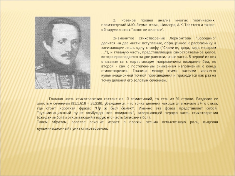 Знаменитое стихотворение Лермонтова "Бородино" делится на две части: вступление, обращенное к рассказчику и занимающее лишь одну строфу ("Скажите, дядя, ведь недаром …"), и главную часть, представляющее самостоятельное целое, которое распадается на две равносильные части. В первой из них описывается с нарастающим напряжением ожидание боя, во второй - сам с постепенным снижением напряжения к концу стихотворения. Граница между этими частями является кульминационной точкой произведения и приходится как раз на точку деления его золотым сечением.