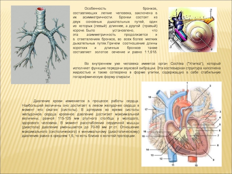 из двух  основных  дыхательных путей, один из  которых (левый)  длиннее, а другой  (правый) короче. Было установлено, что эта  асимметричность  продолжается и в  ответвлениях бронхов, во  всех более  мелких дыхательных путях.Причем  соотношение длины коротких и  длинных  бронхов также составляет  золотое  сечение и равно 1:1,618.