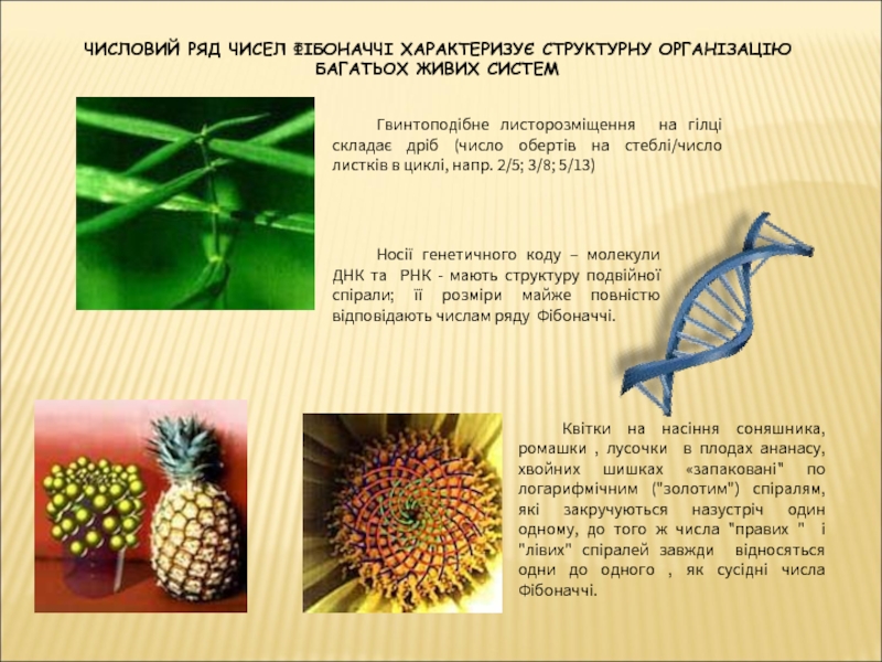 Слайд 19ЧИСЛОВИЙ РЯД ЧИСЕЛ ФІБОНАЧЧІ ХАРАКТЕРИЗУЄ СТРУКТУРНУ ОРГАНІЗАЦІЮ БАГАТЬОХ ЖИВИХ СИСТЕМ
