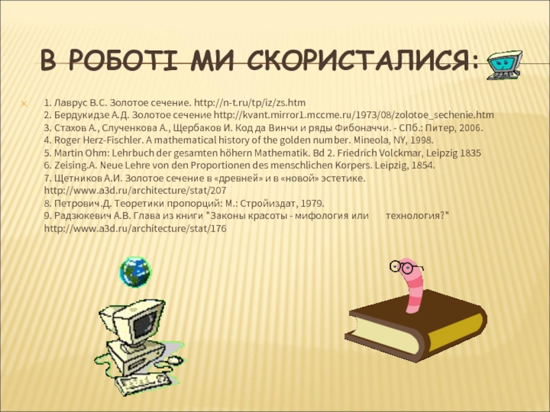 Бердукидзе А.Д. Золотое сечение http://kvant.mirror1.mccme.ru/1973/08/zolotoe_sechenie.htm 3. Стахов А., Слученкова А., Щербаков И. Код да Винчи и ряды Фибоначчи. - СПб.: Питер, 2006. 4. Roger Herz-Fischler. A mathematical history of the golden number. Mineola, NY, 1998. 5. Martin Ohm: Lehrbuch der gesamten höhern Mathematik. Bd 2. Friedrich Volckmar, Leipzig 1835 6. Zeising.A. Neue Lehre von den Proportionen des menschlichen Korpers. Leipzig, 1854. 7. Щетников А.И. Золотое сечение в «древней» и в «новой» эстетике. http://www.a3d.ru/architecture/stat/207 8. Петрович.Д. Теоретики пропорций: М.: Стройиздат, 1979. 9. Радзюкевич А.В. Глава из книги "Законы красоты - мифология или технология?" http://www.a3d.ru/architecture/stat/176
