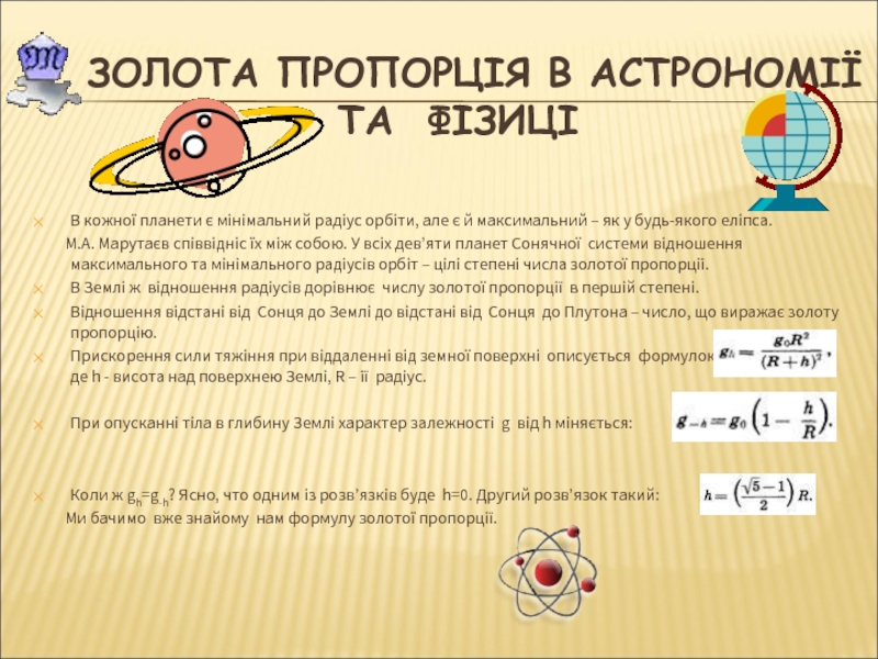 Слайд 17 ЗОЛОТА ПРОПОРЦІЯ В АСТРОНОМІЇ ТА ФІЗИЦІ