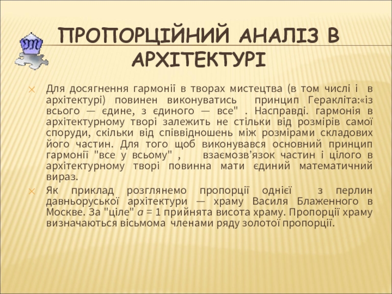 числі і в архітектурі) повинен виконуватись принцип Геракліта:«із всього — єдине, з єдиного — все" . Насправді. гармонія в архітектурному творі залежить не стільки від розмірів самої споруди, скільки від співвідношень між розмірами складових його частин. Для того щоб виконувався основний принцип гармонії "все у всьому" , взаємозв’язок частин і цілого в архітектурному творі повинна мати єдиний математичний вираз.