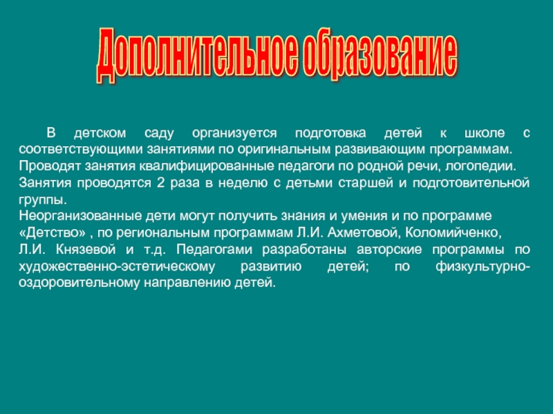 Л.И. Князевой и т.д. Педагогами разработаны авторские программы по художественно-эстетическому развитию детей; по физкультурно-оздоровительному направлению детей.
