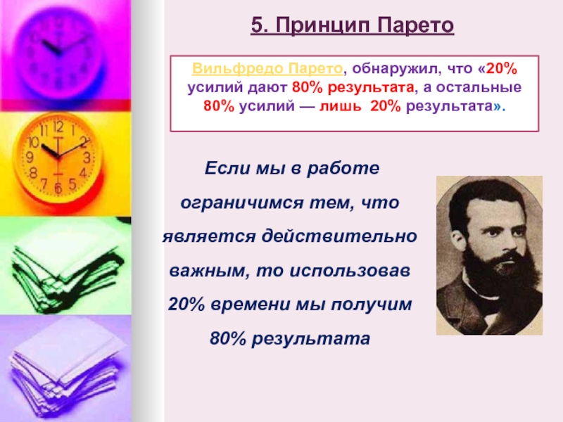 Если мы в работе ограничимся тем, что является действительно важным, то использовав 20% времени мы получим 80% результата