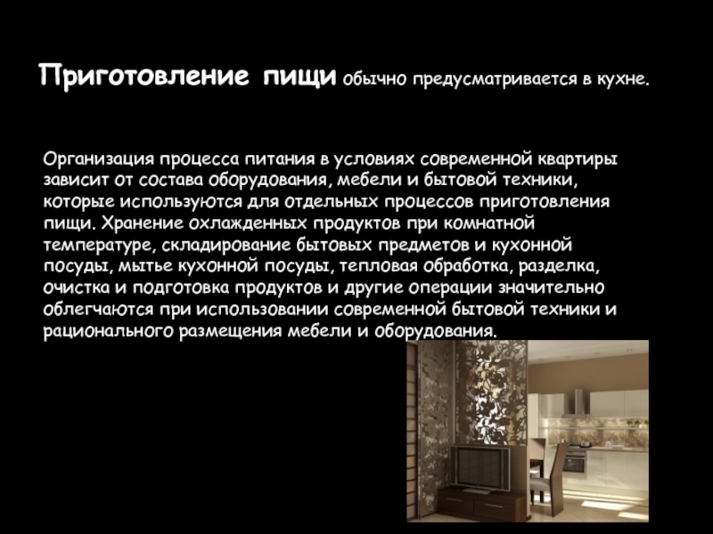 современной квартиры зависит от состава оборудования, мебели и бытовой техники, которые используются для отдельных процессов приготовления пищи. Хранение охлажденных продуктов при комнатной температуре, складирование бытовых предметов и кухонной посуды, мытье кухонной посуды, тепловая обработка, разделка, очистка и подготовка продуктов и другие операции значительно облегчаются при использовании современной бытовой техники и рационального размещения мебели и оборудования.