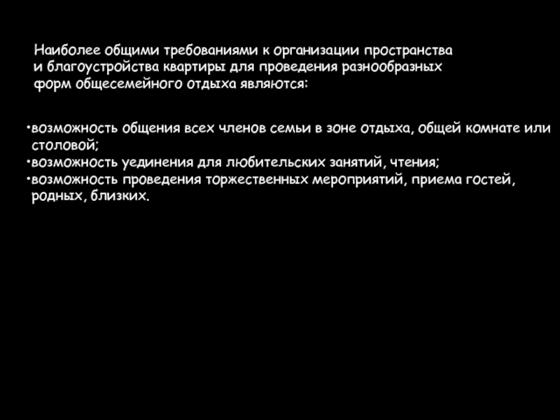 Слайд 19Наиболее общими требованиями к организации пространства и благоустройства квартиры для проведения