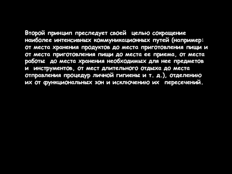 от места хранения продуктов до места приготовления пищи и от места приготовления пищи до места ее приема, от места работы до места хранения необходимых для нее предметов и инструментов, от мест длительного отдыха до места отправления процедур личной гигиены и т. д.), отделению их от функциональных зон и исключению их пересечений.