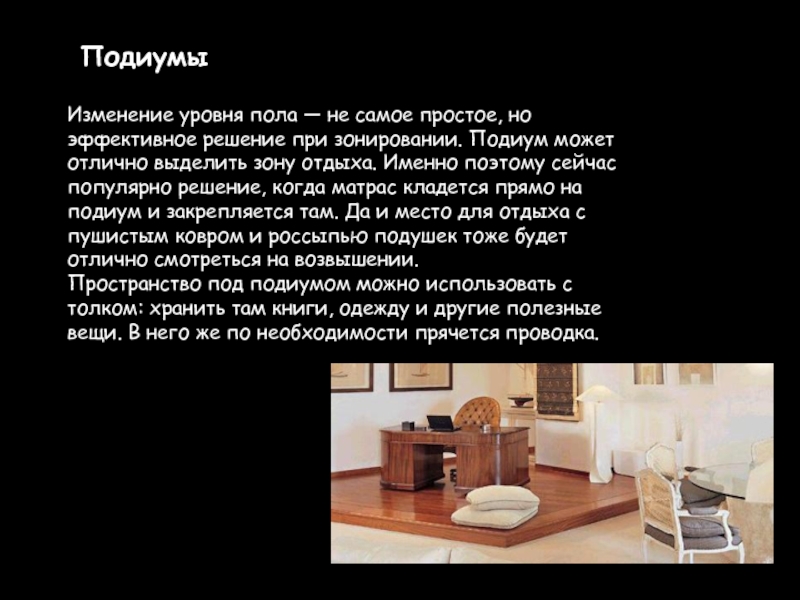 зонировании. Подиум может отлично выделить зону отдыха. Именно поэтому сейчас популярно решение, когда матрас кладется прямо на подиум и закрепляется там. Да и место для отдыха с пушистым ковром и россыпью подушек тоже будет отлично смотреться на возвышении.