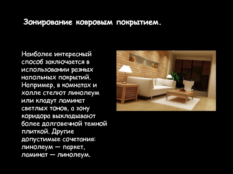 целесообразнее выбирать напольные покрытия, близкие по тону, например, разные оттенки коричневого цвета, так как резкая игра света и тени делает пространство визуально меньше. Ковер, подложенный под ноги, или ковровое покрытие визуально выделит «мягкую» зону отдыха — гостиную.