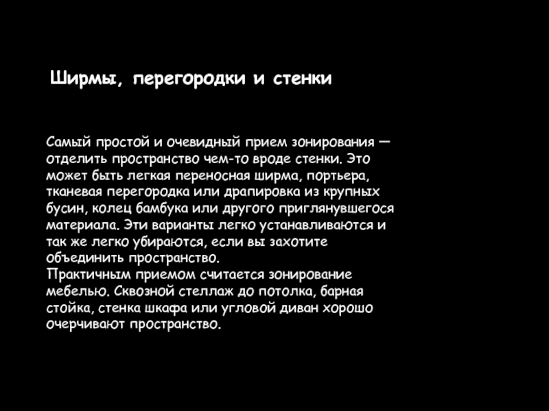 пространство чем-то вроде стенки. Это может быть легкая переносная ширма, портьера, тканевая перегородка или драпировка из крупных бусин, колец бамбука или другого приглянувшегося материала. Эти варианты легко устанавливаются и так же легко убираются, если вы захотите объединить пространство.