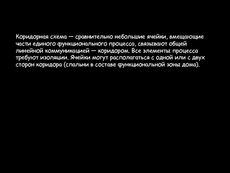 связывают общей линейной коммуникацией — коридором. Все элементы процесса требуют изоляции. Ячейки могут располагаться с одной или с двух сторон коридора (спальни в составе функциональной зоны дома).