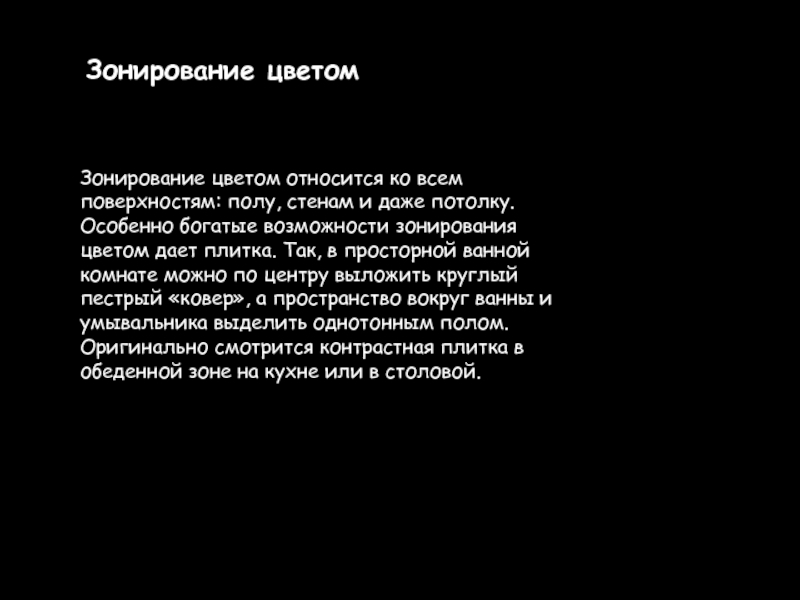потолку. Особенно богатые возможности зонирования цветом дает плитка. Так, в просторной ванной комнате можно по центру выложить круглый пестрый «ковер», а пространство вокруг ванны и умывальника выделить однотонным полом. Оригинально смотрится контрастная плитка в обеденной зоне на кухне или в столовой.