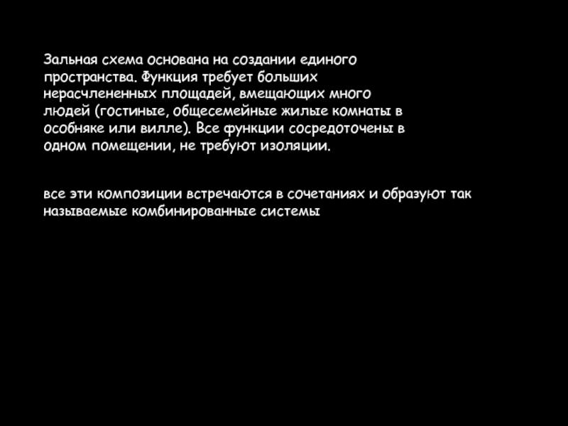 Слайд 37Зальная схема основана на создании единого пространства. Функция требует больших нерасчлененных