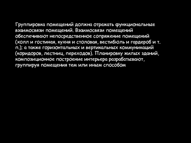 сопряжение помещений (холл и гостиная, кухня и столовая, вестибюль и гардероб и т. п.); а также горизонтальных и вертикальных коммуникаций (коридоров, лестниц, переходов). Планировку жилых зданий, композиционное построение интерьера разрабатывают, группируя помещения тем или иным способом