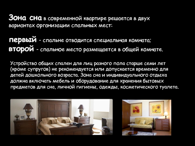 Слайд 17Зона сна в современной квартире решается в двух вариантах организации спальных