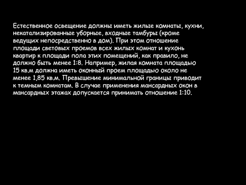 Слайд 39Естественное освещение должны иметь жилые комнаты, кухни, некатализированные уборные, входные тамбуры
